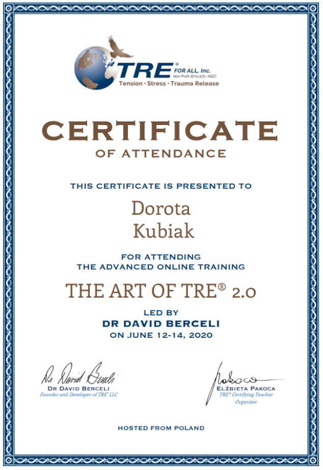 Nie wiem, zależy od Twojego celu. Czasem 1 zmienia dużo. Czasem potrzeba 3-5 żeby układ nerwowy zaufał. Do trudniejszych rzeczy, trzeba więcej sesji. Standardowo, aby poznać TRE, na poziomie głębszym (nauczyć się wchodzić w drżenia oraz stosować interwencje) potrzeba 4-5 sesji TRE. Pierwsza sesja TRE jest z reguły, takim WOW, to się samo dzieje. Jakim cudem.